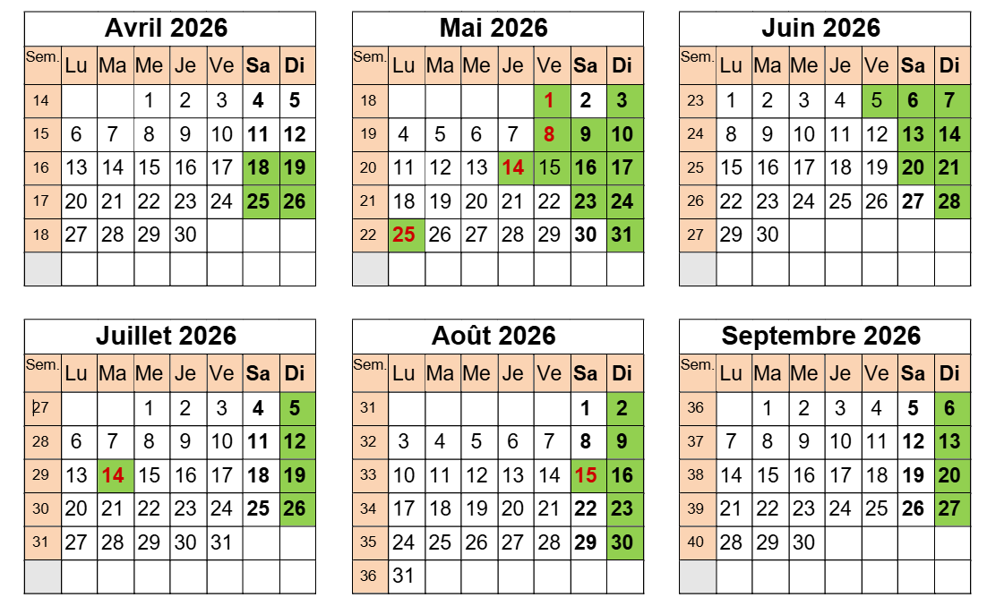 Les dates d'ouverture sont identifiées en vert sur le calendrier. Ouvert de 13h à 19h.