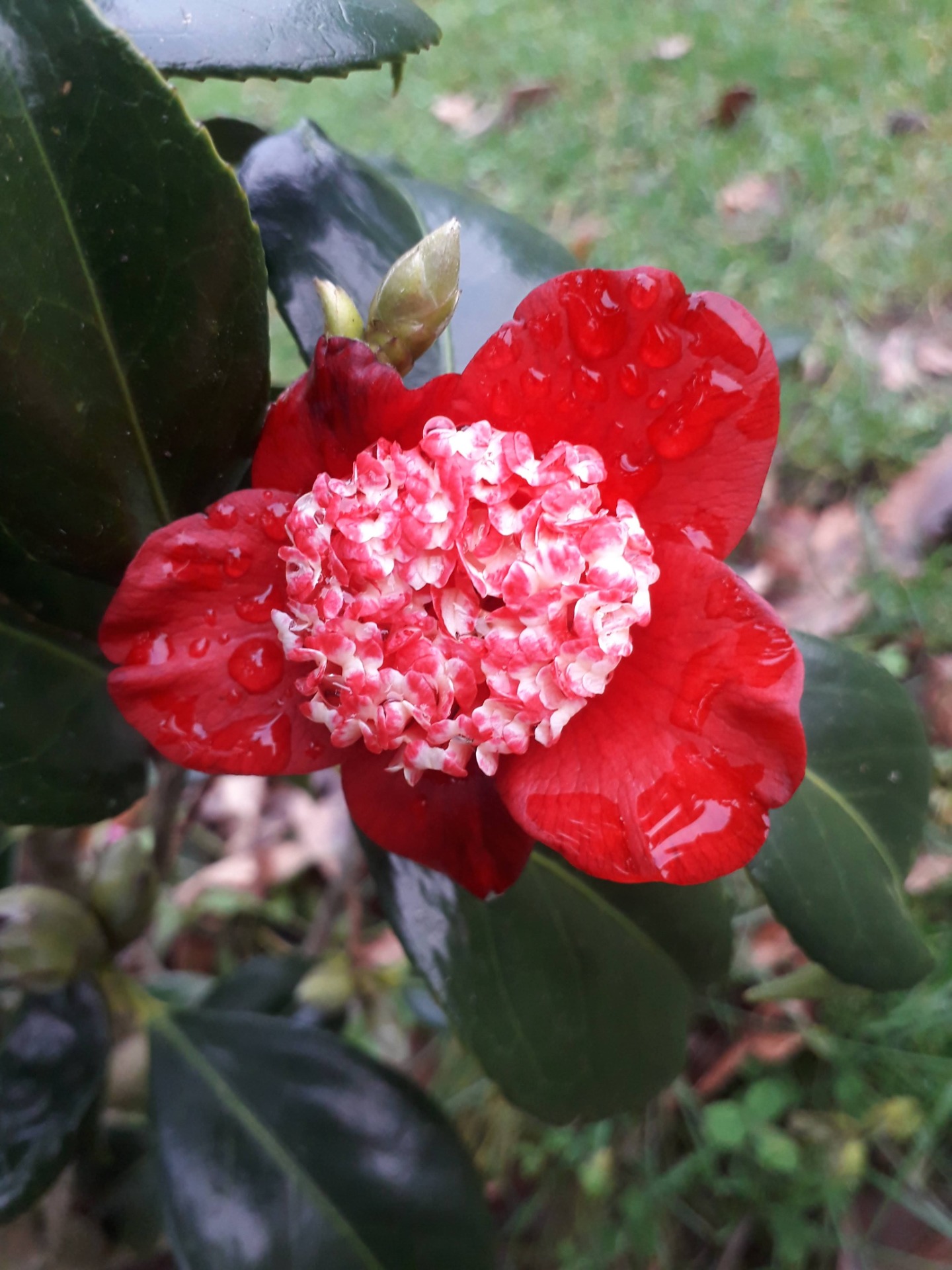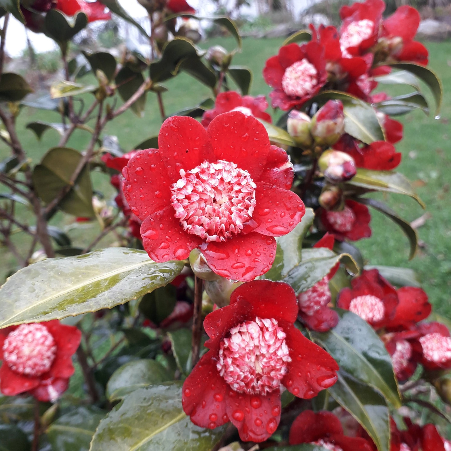Sa floraison, généreuse et précoce, s'étend généralement de la fin de l'hiver au début du printemps, apportant couleur et vitalité au jardin à une période où les floraisons sont encore rares. Les fleurs, de taille moyenne à grande, présentent des pétales d'un rouge soutenu, parfois nuancé de rose foncé, disposés de manière régulière et harmonieuse. Elles contrastent magnifiquement avec le feuillage persistant, vert foncé, brillant et coriace, typique des camélias.