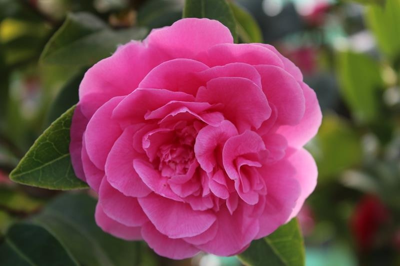 'Debbie' se distingue par ses grandes fleurs semi-doubles à doubles, d'un rose soutenu délicatement nuancé de tons plus clairs vers le cœur. Les pétales, nombreux et soyeux, s'ouvrent progressivement de la fin de l'hiver jusqu'au début du printemps, offrant une floraison longue et régulière. Contrairement à certains camélias, ses fleurs tombent entières, limitant les dégâts sur le feuillage et facilitant l'entretien.