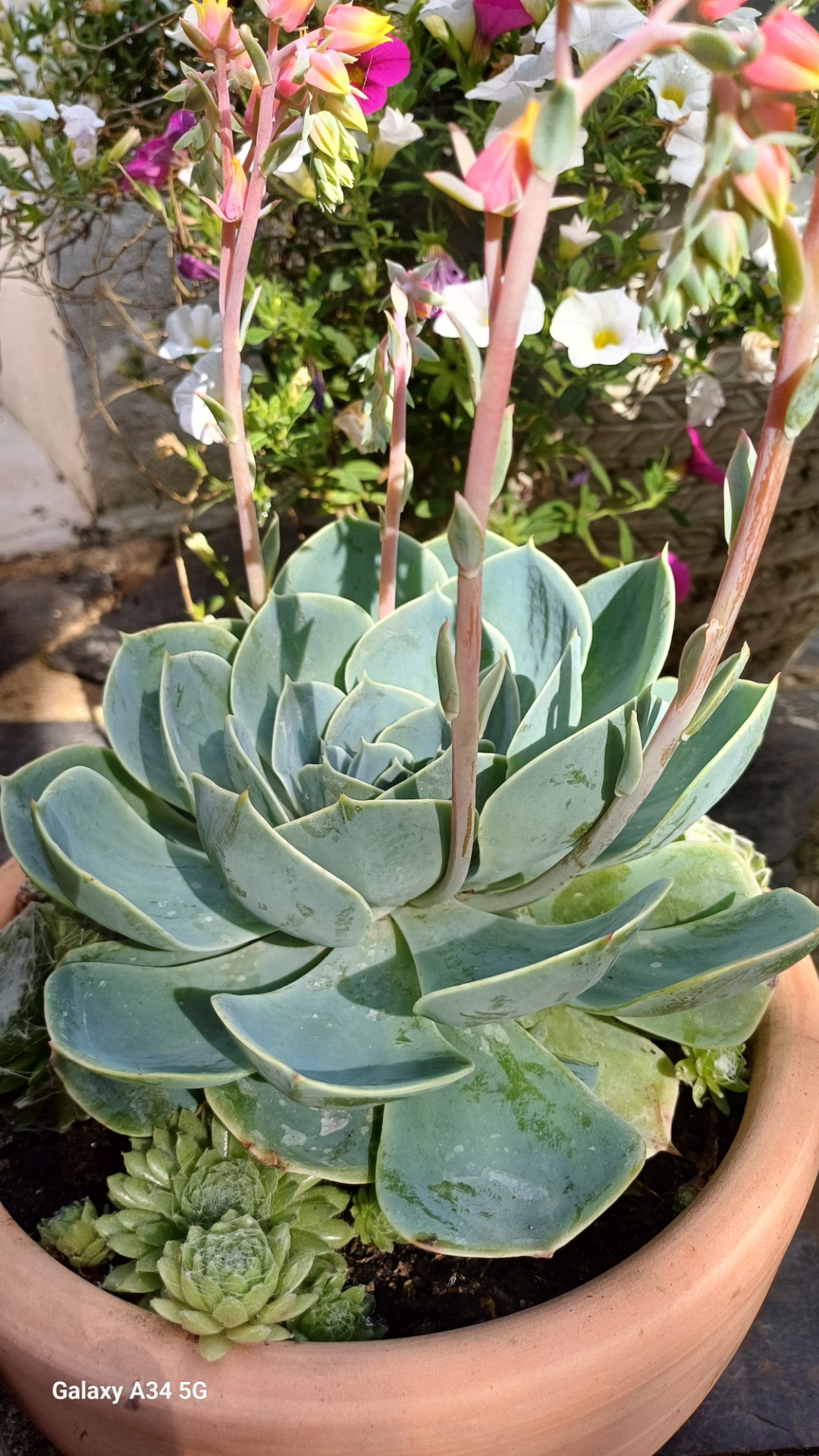 Au printemps ou en été, l'Echeveria se pare de délicates hampes florales portant de petites fleurs en clochettes, souvent rose orangé ou rouge corail. Ces floraisons aériennes contrastent avec la structure compacte de la rosette et apportent une touche de légèreté à l'ensemble.
