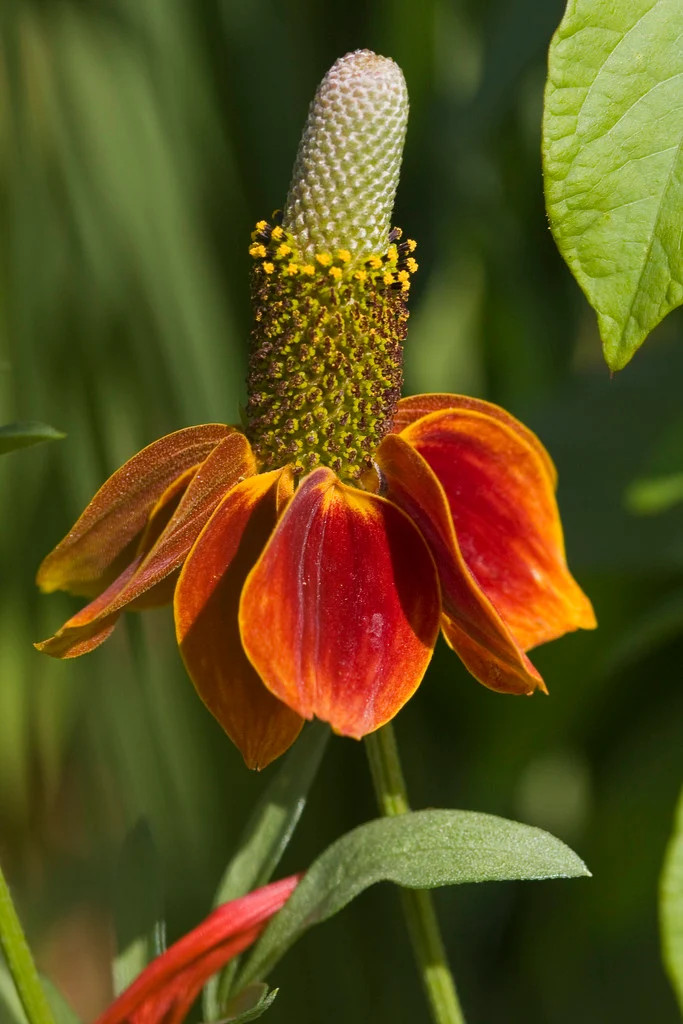 Cette plante se distingue par sa floraison singulière. Ses fleurs présentent un cœur conique très allongé, brun à pourpre, entouré de pétales retombants généralement jaunes bordés de rouge, bien que certaines variétés puissent être entièrement rouges ou brunâtres. Cette silhouette élancée et graphique lui confère une allure sauvage et élégante, très appréciée dans les compositions naturelles.
